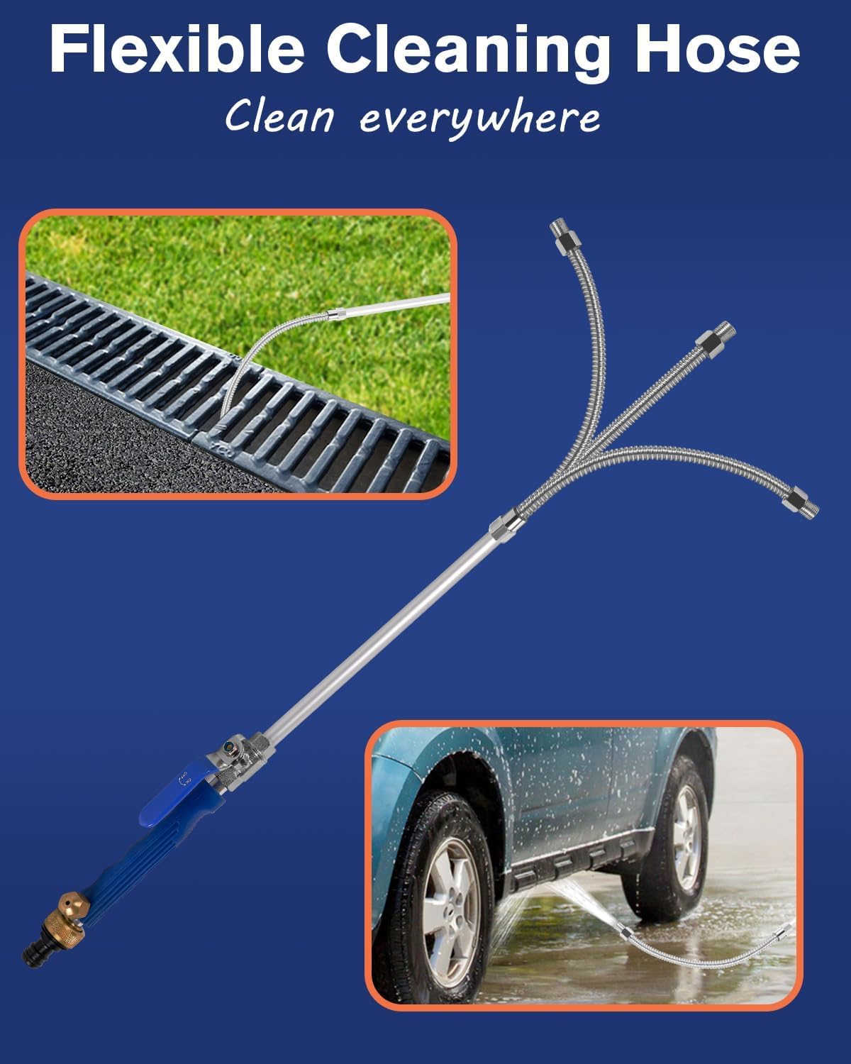 • 【Flexible cleaning wand】The flexible hose is an extended soft wand which is made of stainless steel,it can be bent any angles, you just need to bend the metal hose properly,can easily reach some places where is difficult to clean. Such as gutter and the roof of the car. No need bend down your body