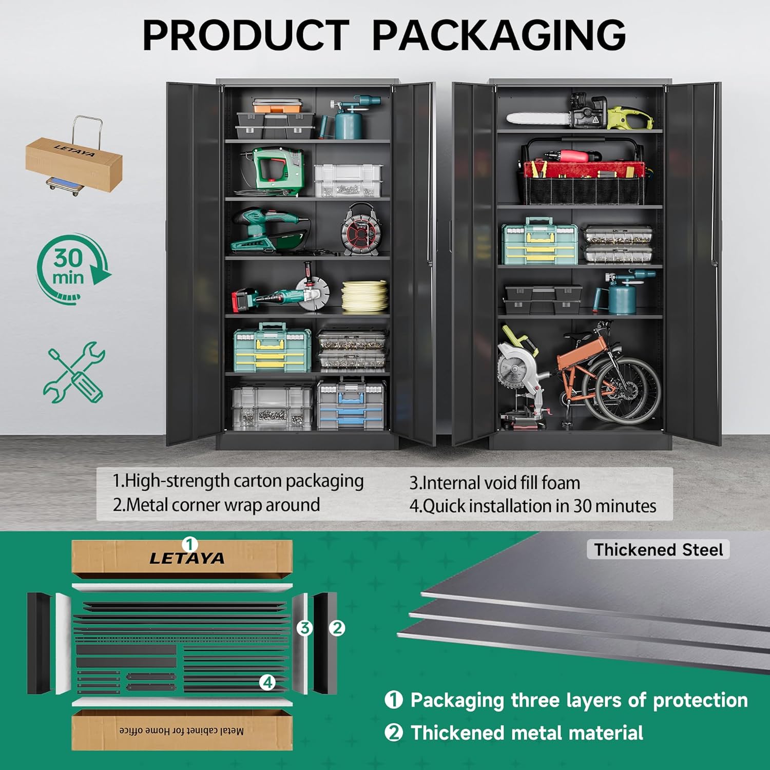 • 『Packaging Protection』: Letaya storage cabinet package uses a lots of foam and reinforced metal corners protect the edges from getting dented, to prevent damage to the panels during shipping.Of course, in the unfortunate event of an damage,please contact us in time for processing problem.(Note: ferrous metal corner guards are not part of the product)